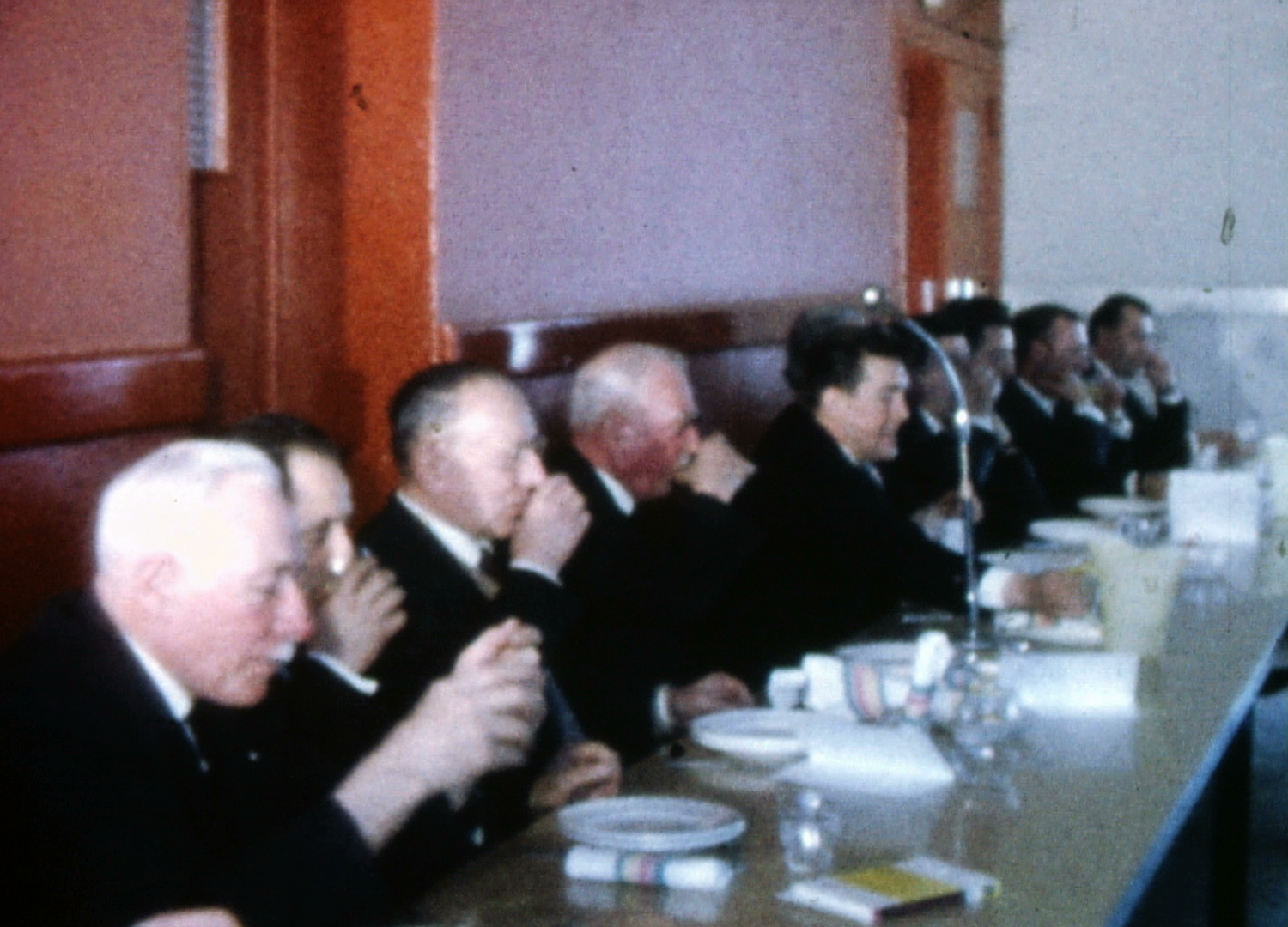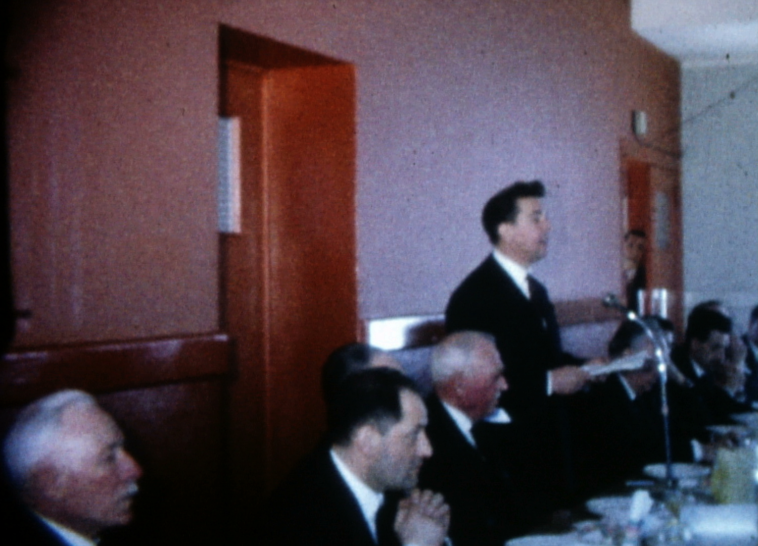 Plans en intérieur : Discours de Gustave Ansart. Images du repas et de toasts portés, applaudissements des participants. Plans sur différents Anciens qui prennent la parole au micro dans la salle. Quelques plans de la salle.