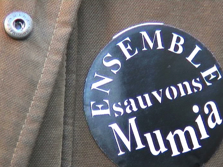 Banderoles « libérez Mumia », « ECPM » ; « Américain contre la guerre ».