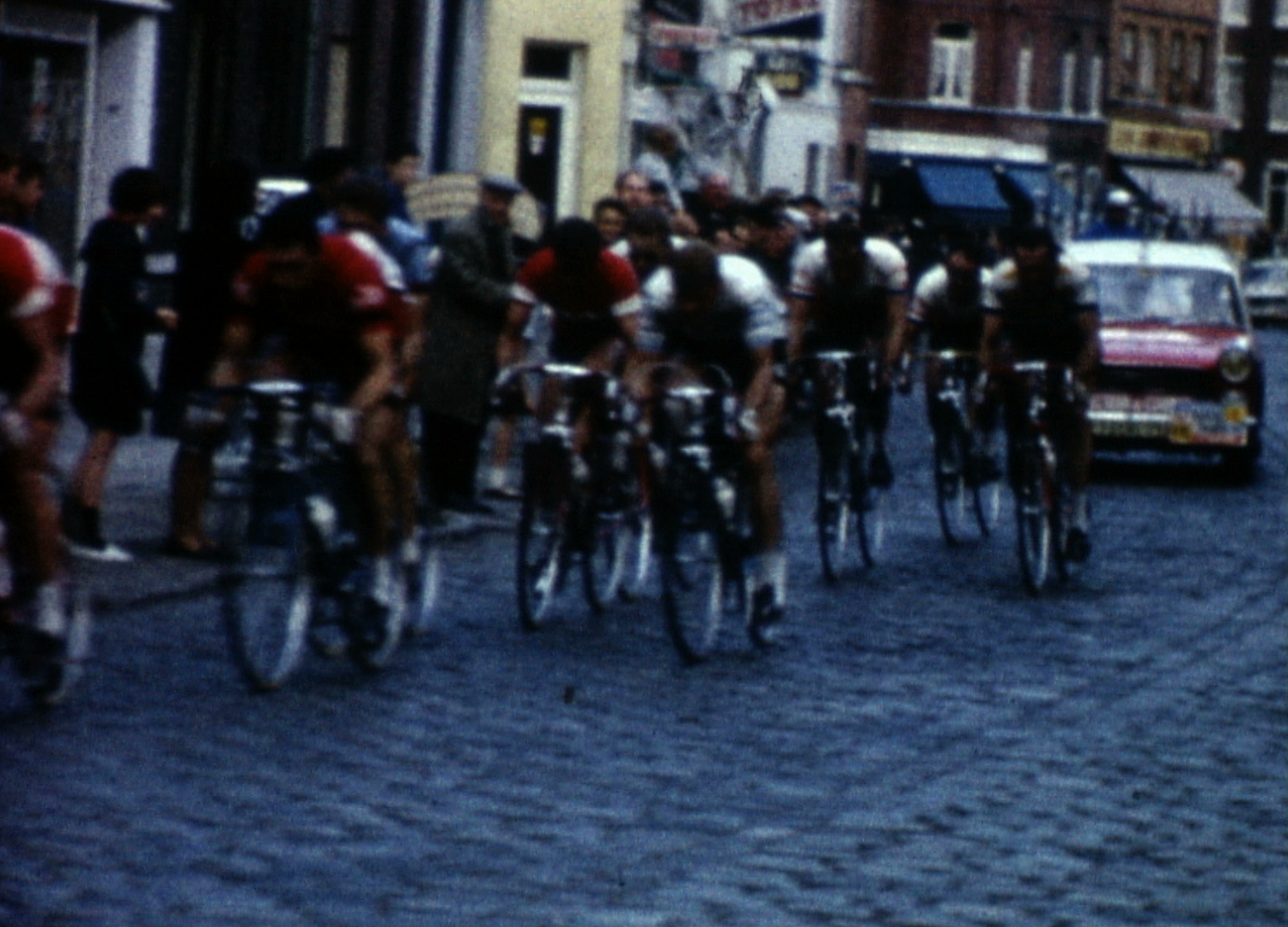 Images d'une course cycliste dans les rues de Roubaix. Au vu de l'ampleur de la caravane, il pourrait s'agir de l'édition 1965 du Paris-Roubaix ou de l'étape du Tour de France 1965 qui passait par Roubaix - toutefois, ni l'une ni l'autre de ces dates ne correspondent à l'inscription notée sur la bobine par le cinéaste (12 juin 1965)