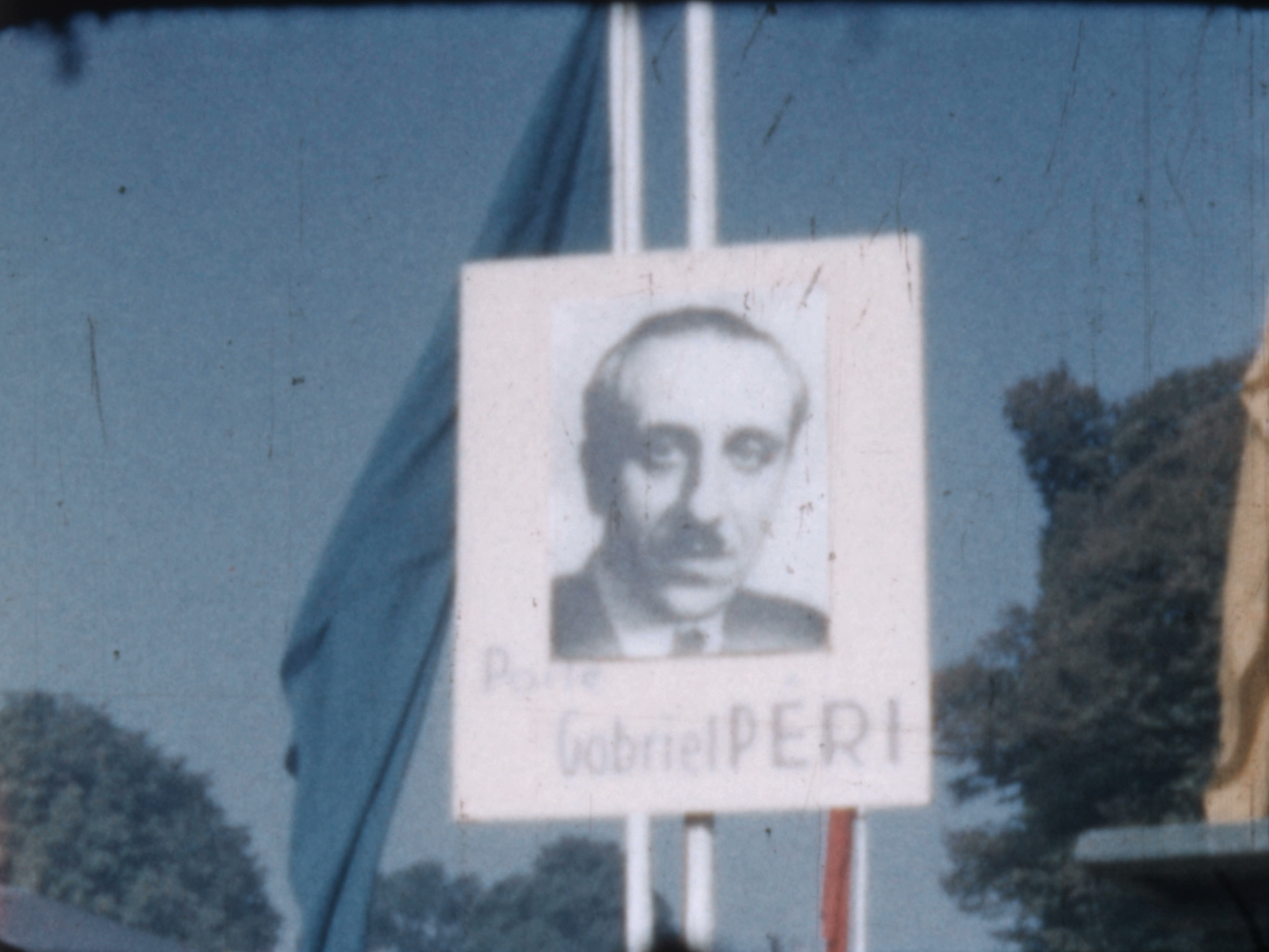 Séquence en couleurs. Fête de l'Humanité. ortrait de Gabriel Péri. Stand UJCF. Tombola