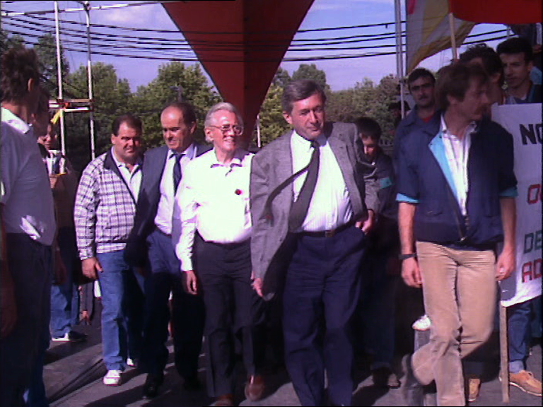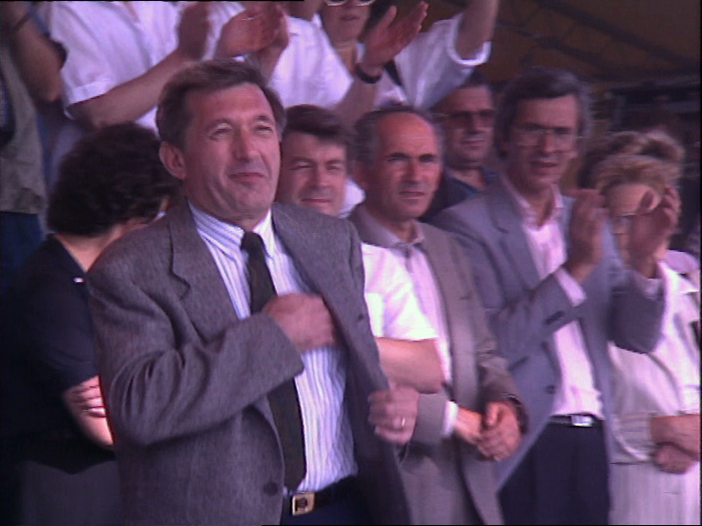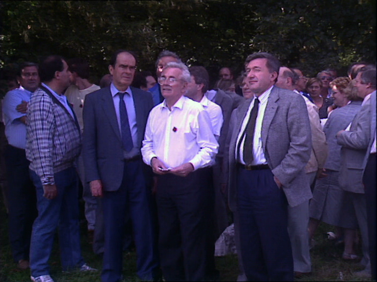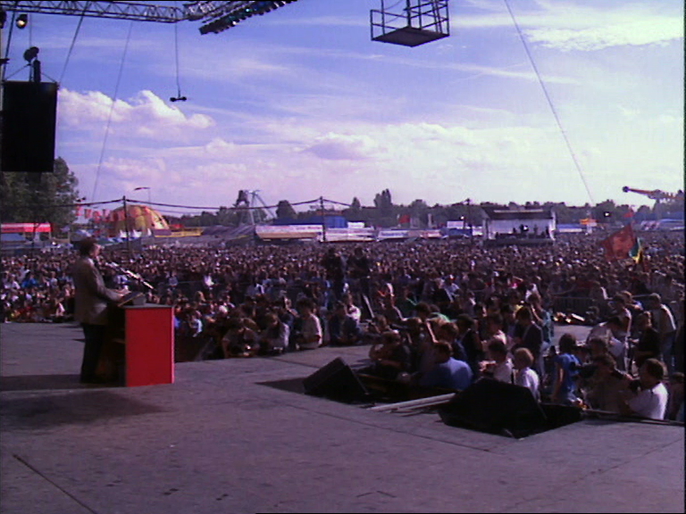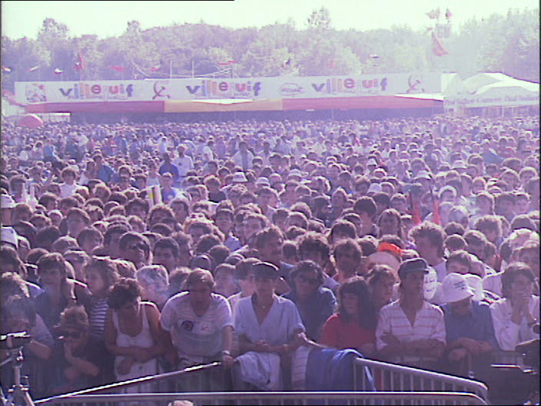 Quelques vues du discours final de la Fête de l'Humanité 1987. On aperçoit les coulisses puis le discours des dirigeants communistes sur la grande scène de la Fête. Les membres du Comité central du PCF entourent Roland Leroy, directeur du journal L'humanité, Georges Marchais, secrétaire du PCF, et André Lajoinie, candidat communiste à l'élection présidentielle 1988.