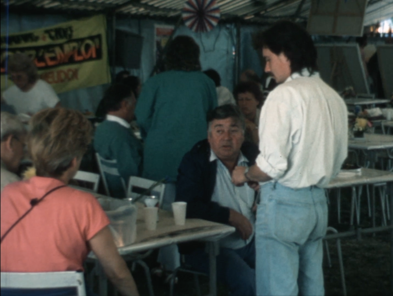 Fête de l'Humanité 1989, l'intérieur des stands. Une exposition de dessins. "Hommage à Paulo". Plan sur le menu du stand de la section de Meudon.