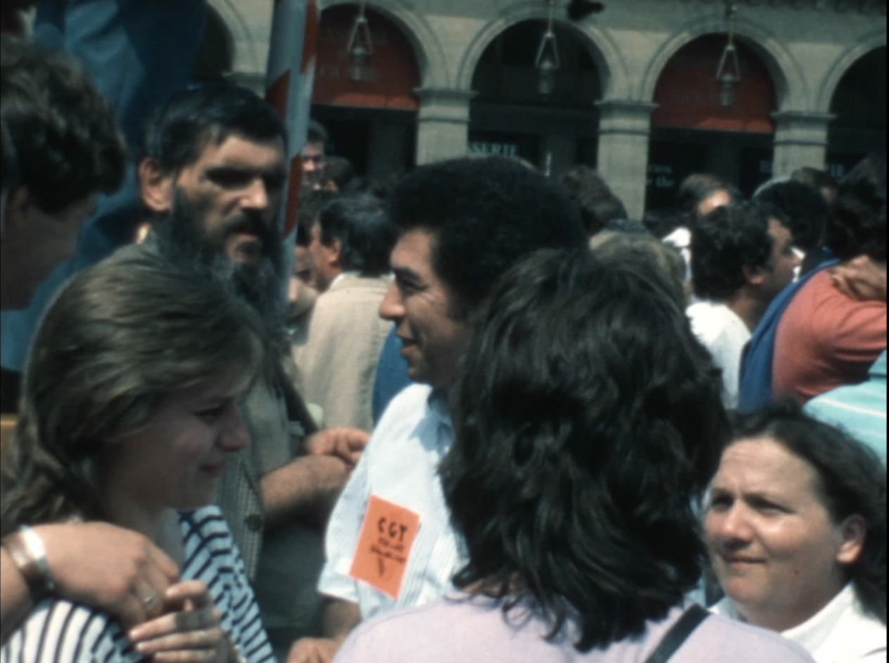 Trois événements différents sur cette bobine : un rassemblement devant le Louvre pour la réintégration des 11 de Renault, des vues prises depuis un train à l'abord d'une grande gare parisienne, et la Fête de l'Humanité 1989.