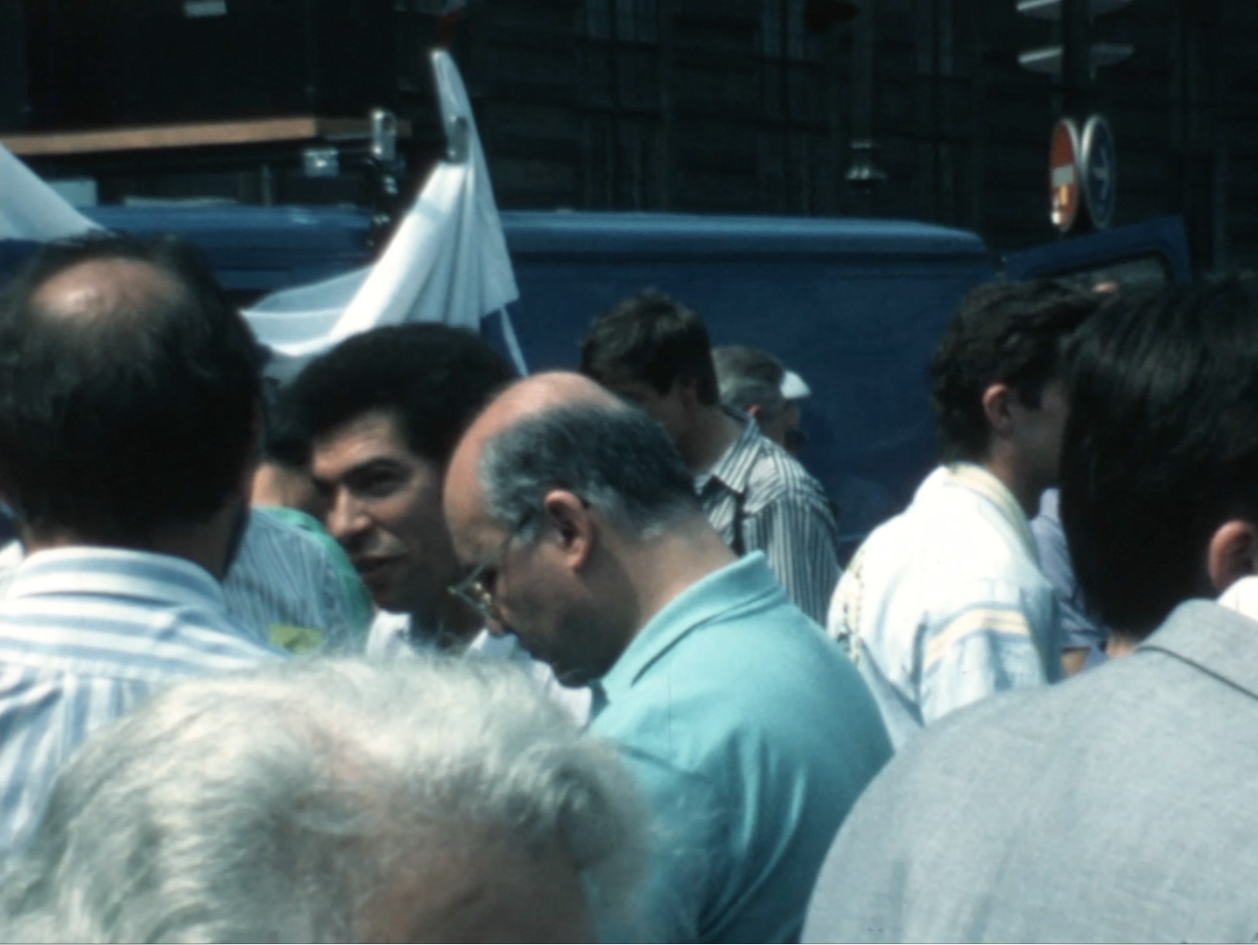 Devant le Louvre, peut-être au moment de l'inauguration de la pyramide du Louvre ? Plusieurs plans sur un homme non identifié, visiblement syndicaliste et/ou avocat ?