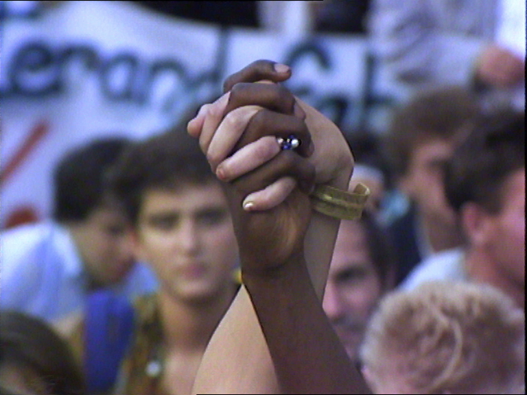 Les participants à la manifestation sont jeunes ; certains ont le visage grimé en noir. La caméra s'attarde sur un jeune homme noir et une jeune fille blanche qui brandissent leurs mains jointes, image qui sera souvent reprise pour illustrer la lutte contre l'Apartheid.