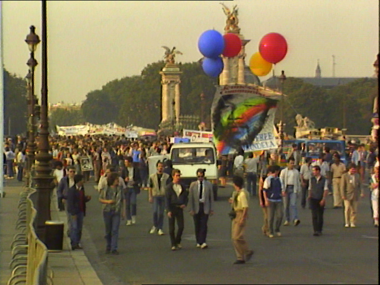 Lycéens et étudiants défilent dans le 7ème arrondissement, de l'Ambassade d'Afrique du Sud à Matignon. Jacques Perreux, secrétaire du MJCF a rendez-vous avec un conseiller du premier ministre Laurent Fabius pour exiger des sanctions économiques envers l'Afrique du Sud afin de faire cesser le régime de l'Apartheid.