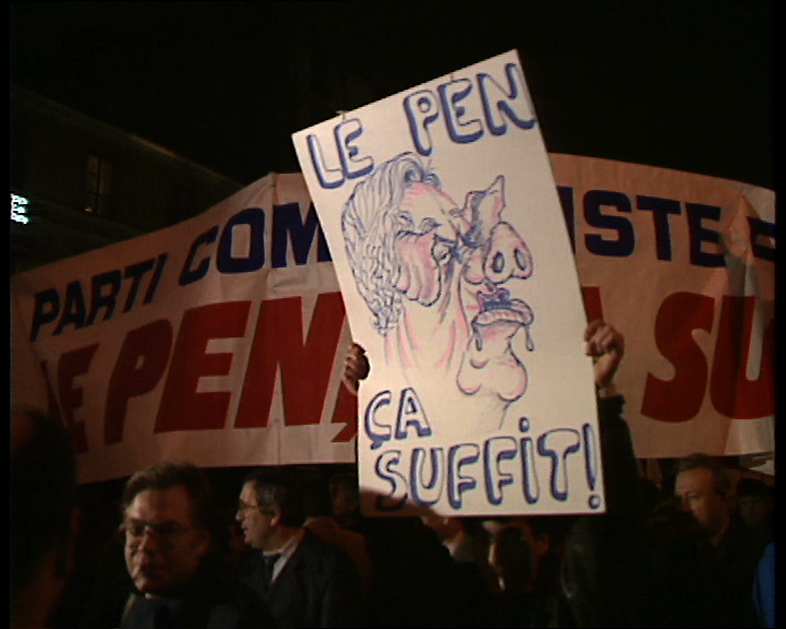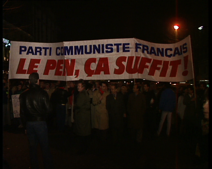Le 27 janvier 1988 ont lieu des manifestations contre Jean-Marie Le Pen dans plusieurs villes de France, à l'initiative du PCF, de la CGT, du MJCF, du MRAP, d'associations d'anciens déportés et de diverses organisations de gauche. Cette mobilisation massive a pour but de dénoncer le passage du dirigeant du Front National dans l'émission télévisée "L'heure de vérité" en ce 27 janvier, jour anniversaire de la libération du camp d'Auschwitz - invitation qui lui a été faite en tant que seul candidat déclaré à ce jour pour l'élection présidentielle de 1988. Ces rushes montrent quelques aspects du défilé qui a lieu à Paris.