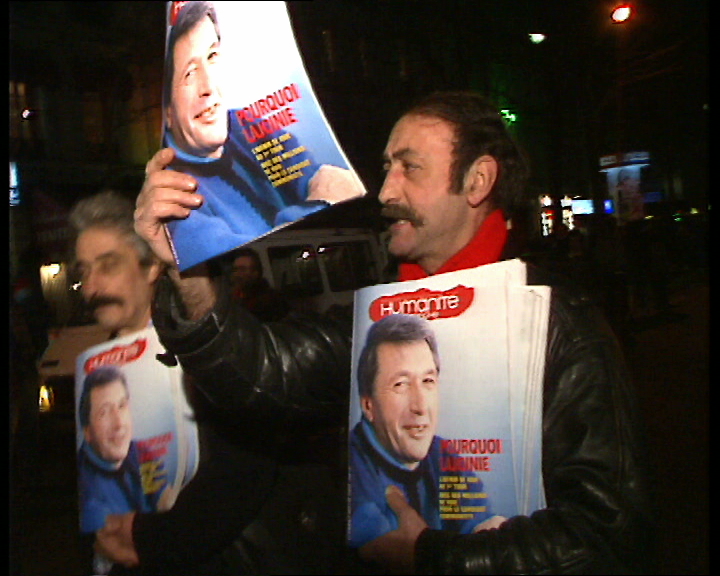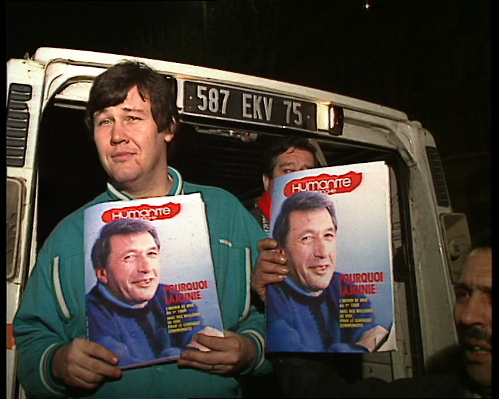 Plusieurs militants CDH (Comité de Diffusion de l'Humanité) vendent l'Humanité Dimanche dans le cortège, sur laquelle on aperçoit le portrait d'André Lajoinie, futur candidat pour l'élection 1988.