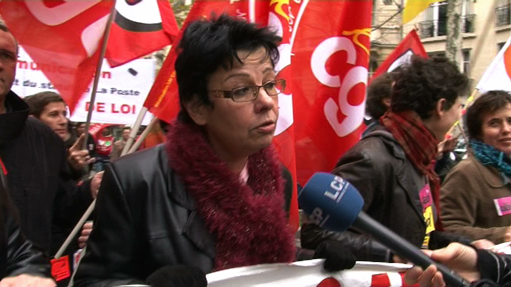 Les employés de la Poste sont également inquiets. Maryse Dumas, de la CGT, défile derrière une banderole syndicale unitaire (CGT, Sud, CFDT, CFTC, FO) contre le prochain "changement de statut" de la Poste, qui est ni plus ni moins une privatisation qui ne dit pas son nom. La Poste assurant à la fois un service de courrier et de banque, il est dangereux de livrer ce service public à "la finance internationale".