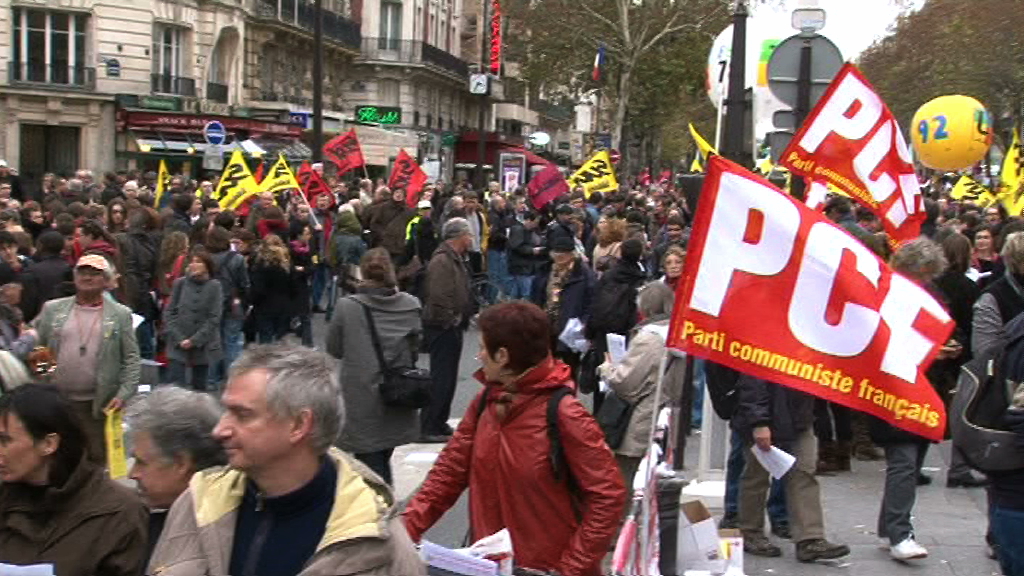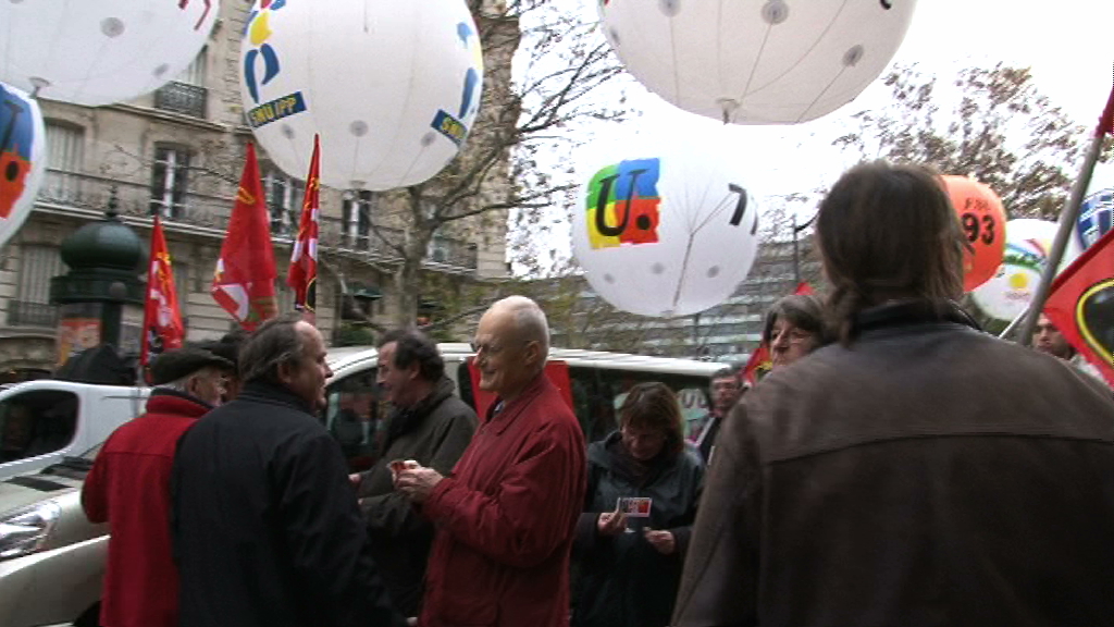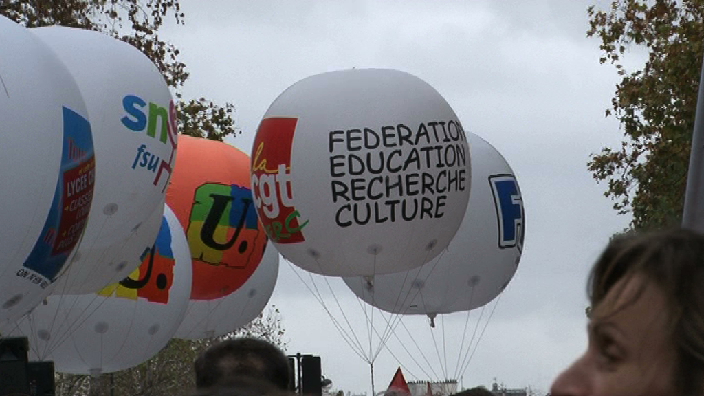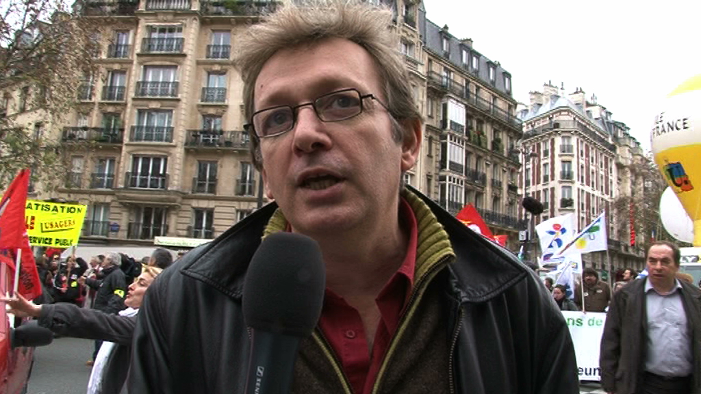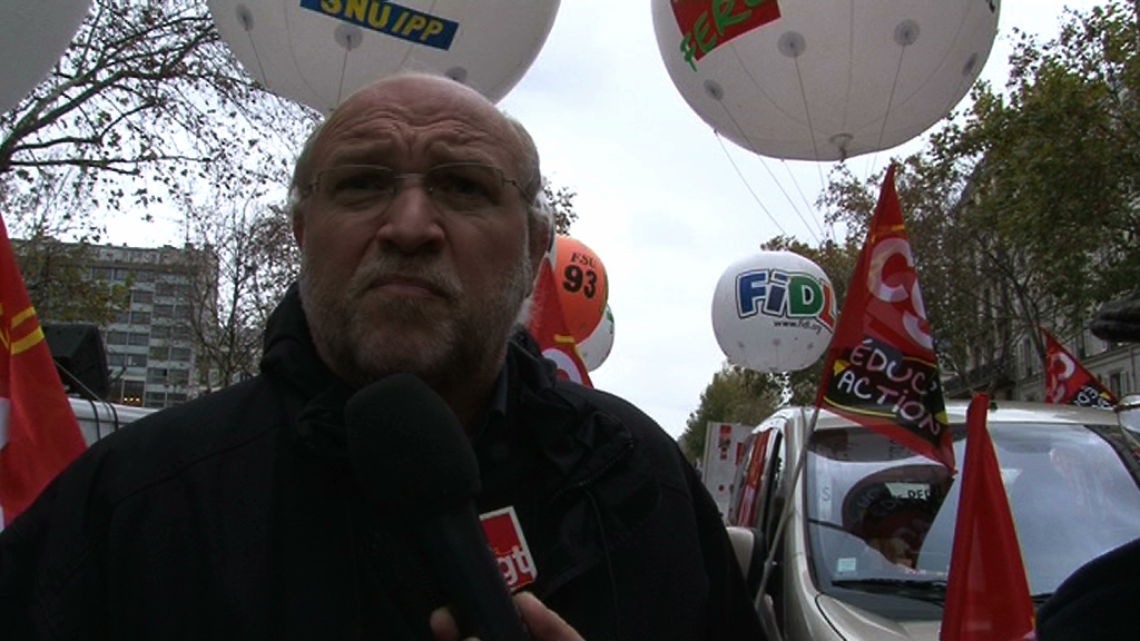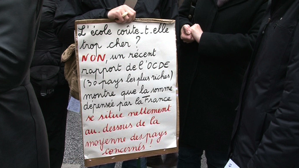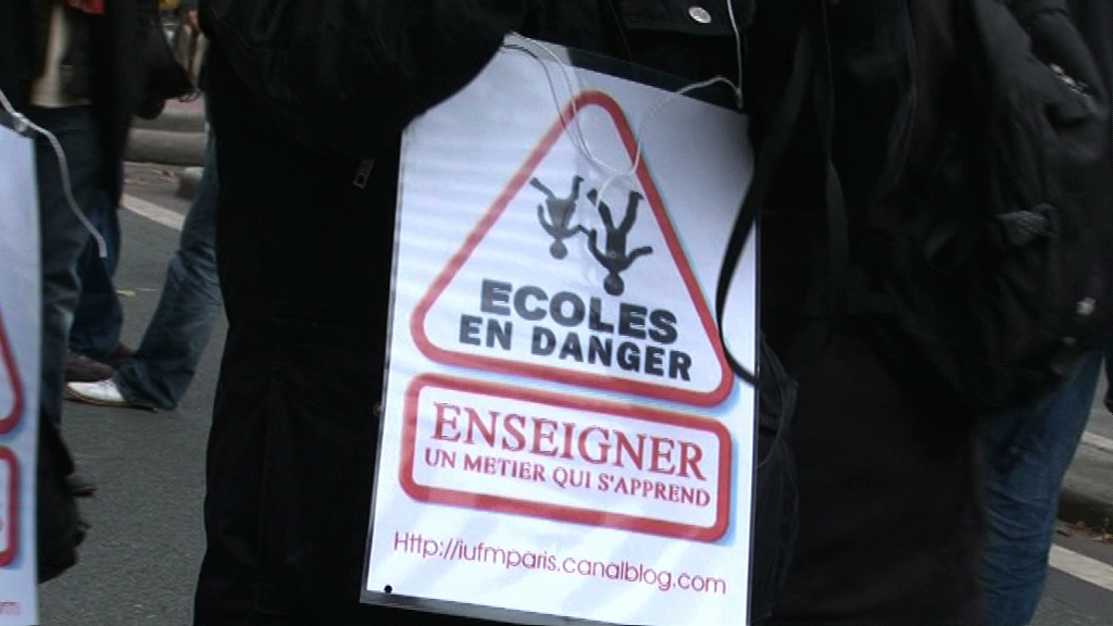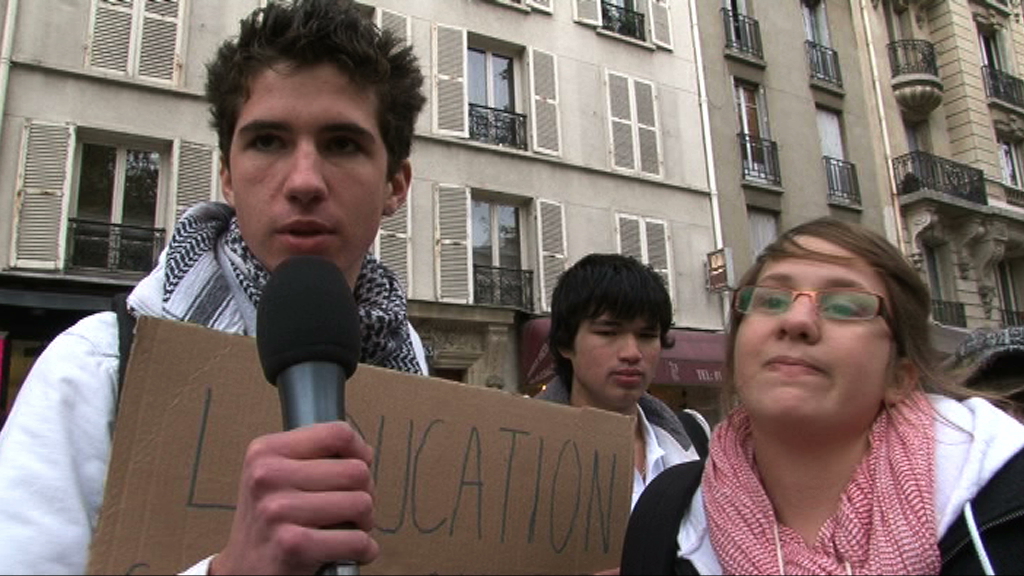 Après des plans d'ensemble sur la manifestation (les cortèges étudiants notamment, qui réclament "du fric pour les lycées et les face, pas pour les banques"), plusieurs enseignants expriment leurs craintes. D'abord Alain Vrignault, secrétaire national de la CGT Education, qui dénonce les conditions d'enseignement qui se dégradent à vue d’œil avec l'augmentation constante des effectifs par classe, notamment en lycée professionnel. Depuis le début du mandat de Nicolas Sarkozy, ce sont 50 000 postes d'enseignants qui ont été ou vont être supprimés.