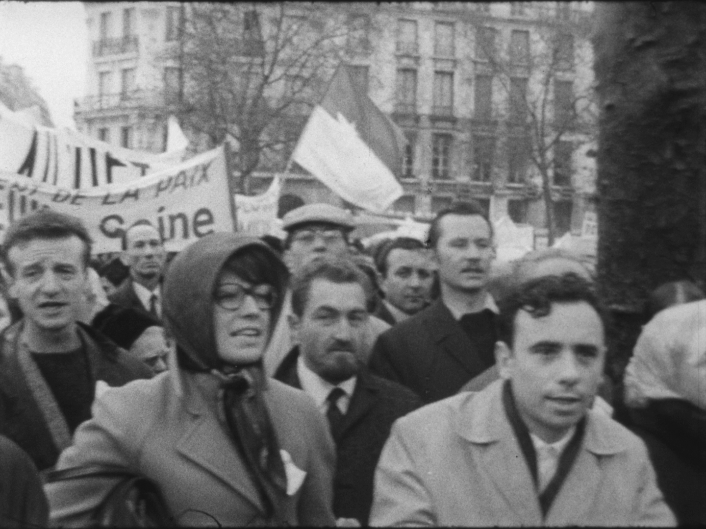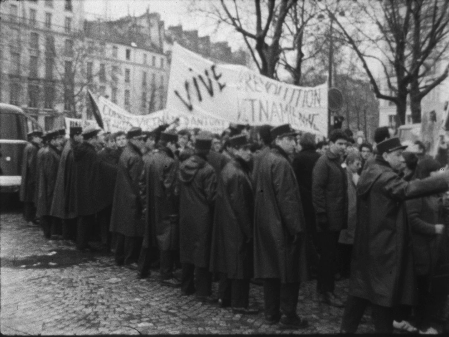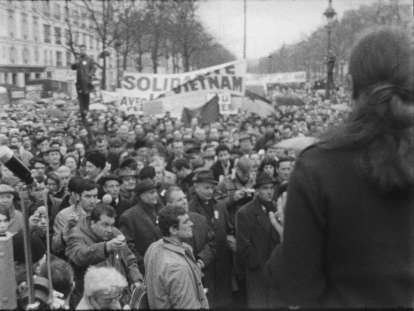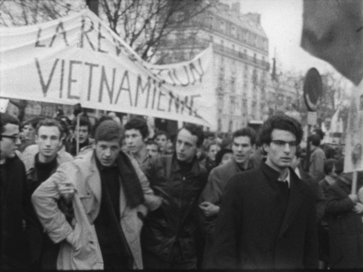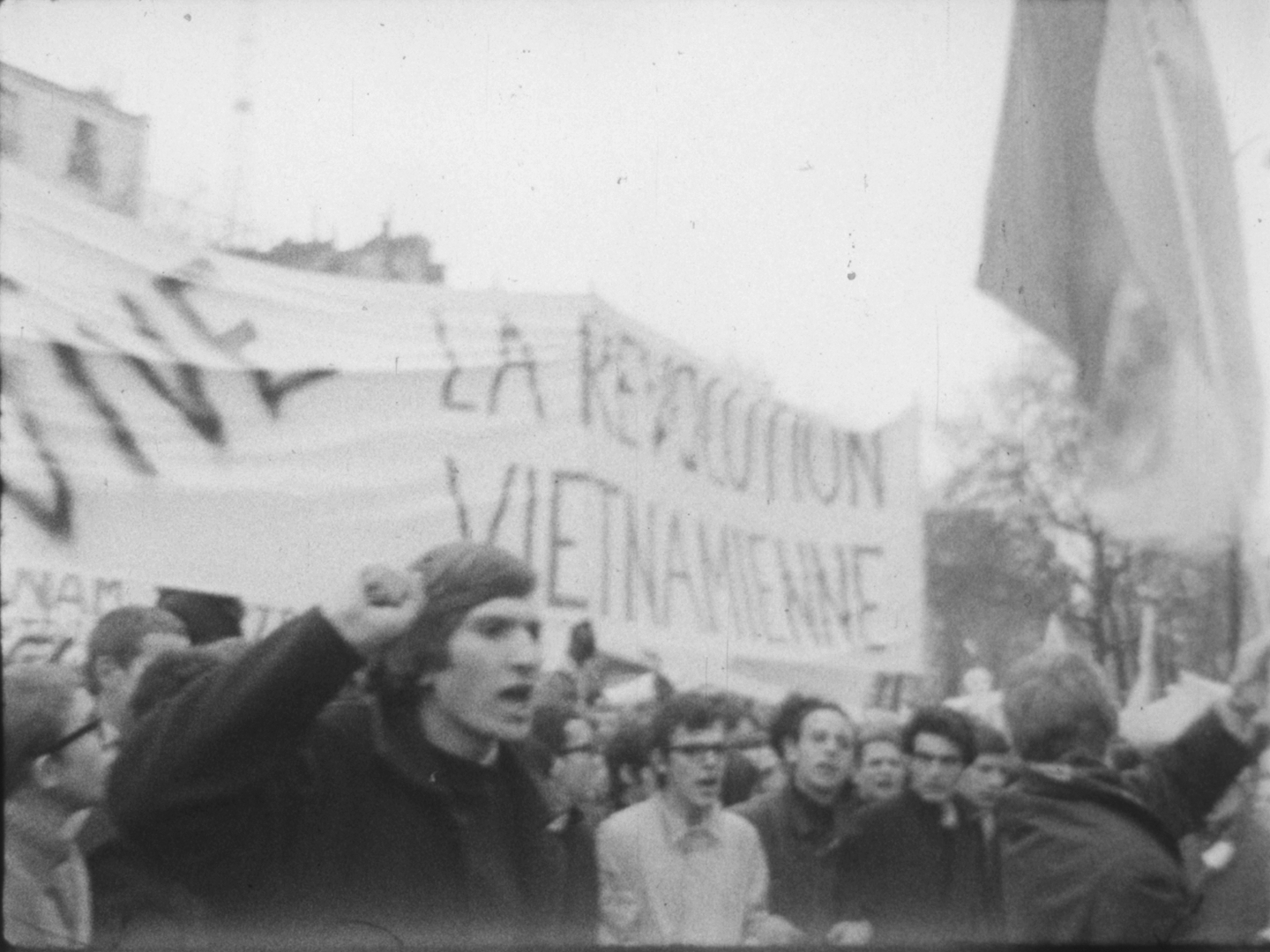 A l'issue des discours, la foule se dirige vers le Faubourg-Saint-Antoine. On aperçoit de nombreux jeunes gens défilant sous des banderoles, dont Alain Krivine, exclu de l'UEC quelques temps auparavant et confondateur de la JCR (Jeunesse Communiste Révolutionnaire)