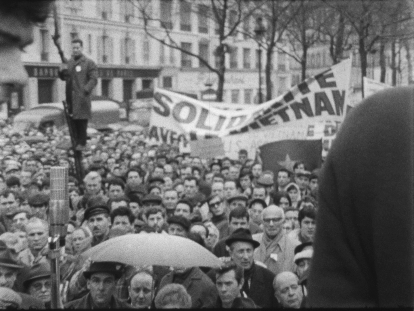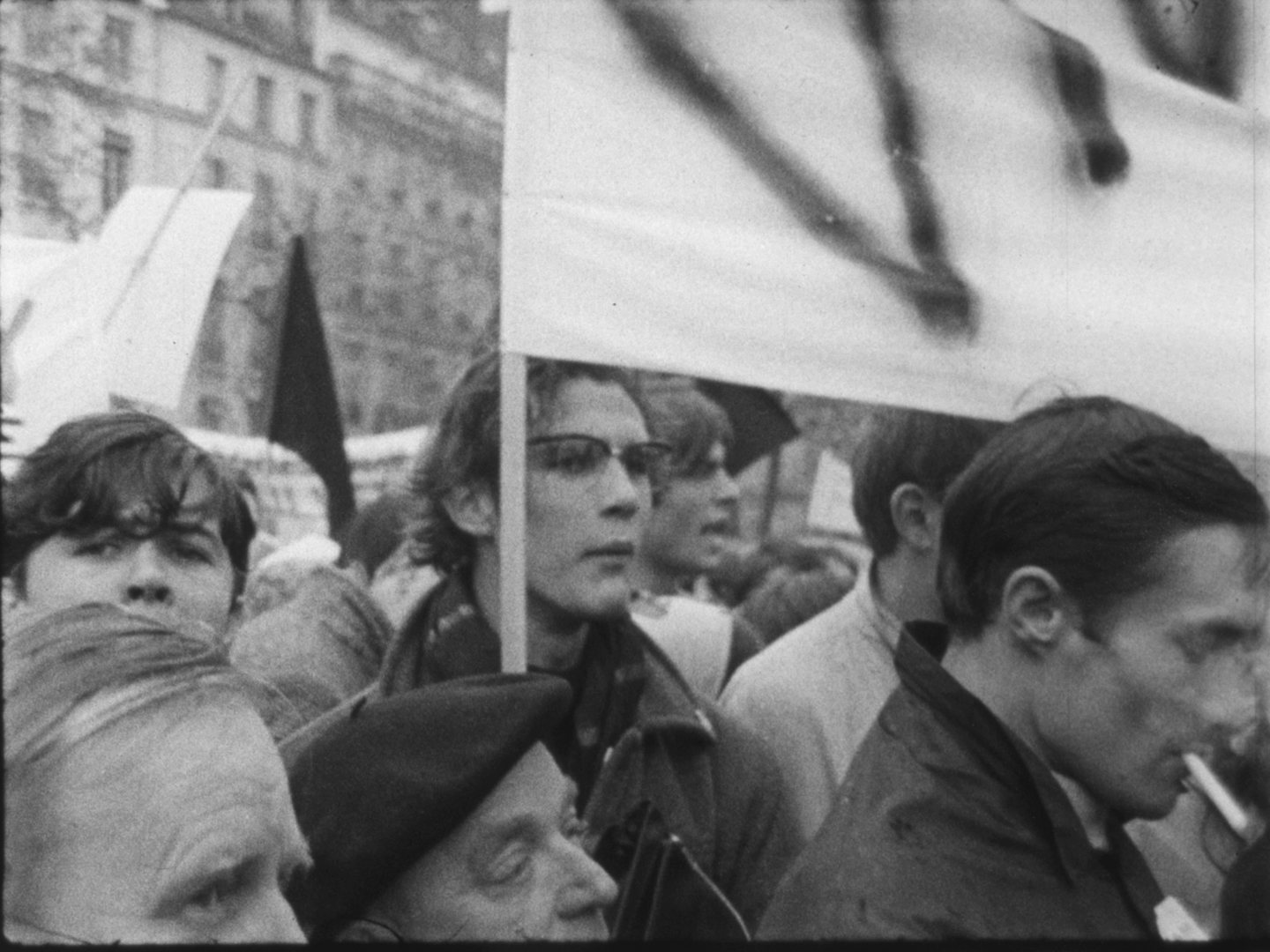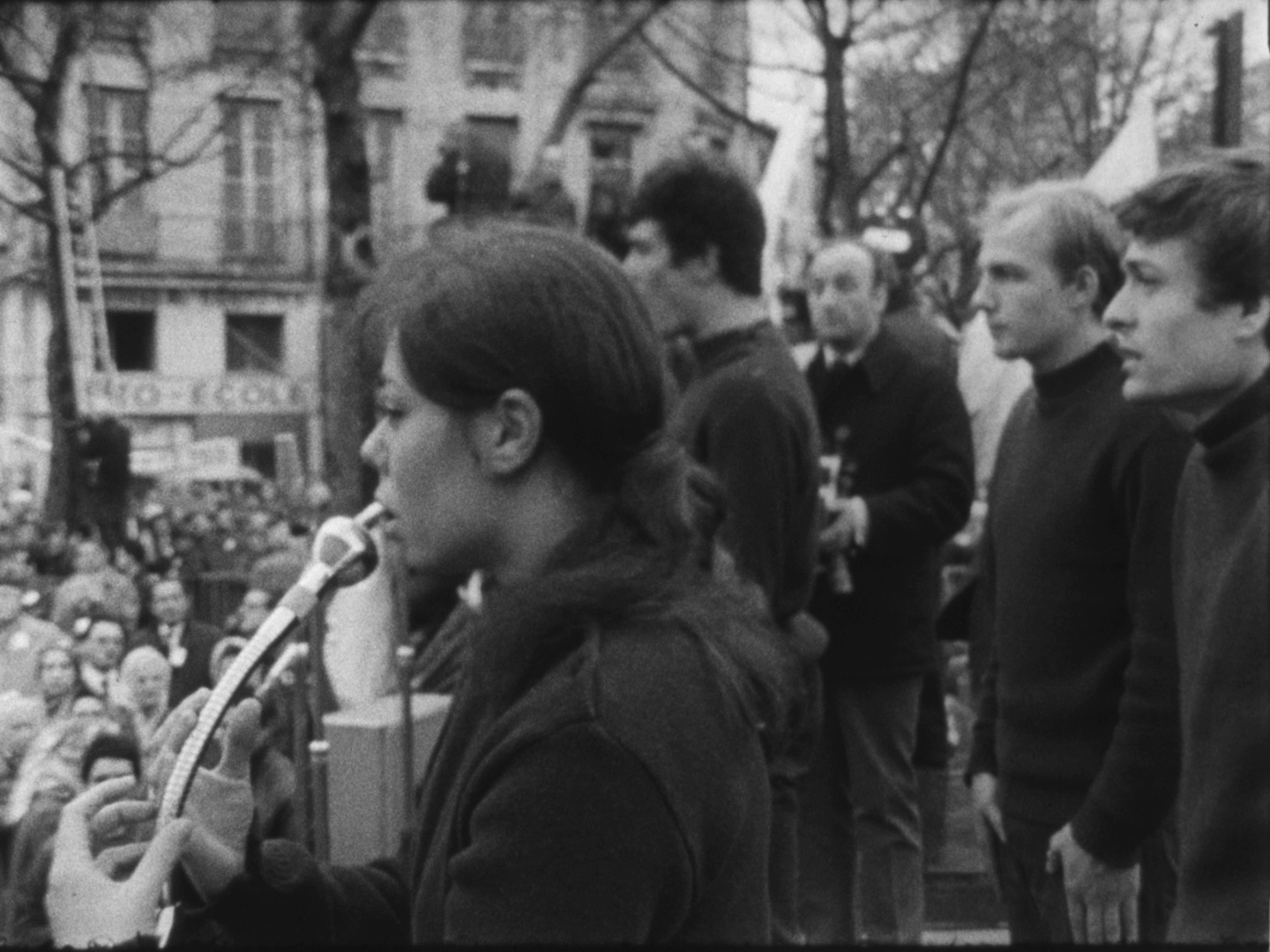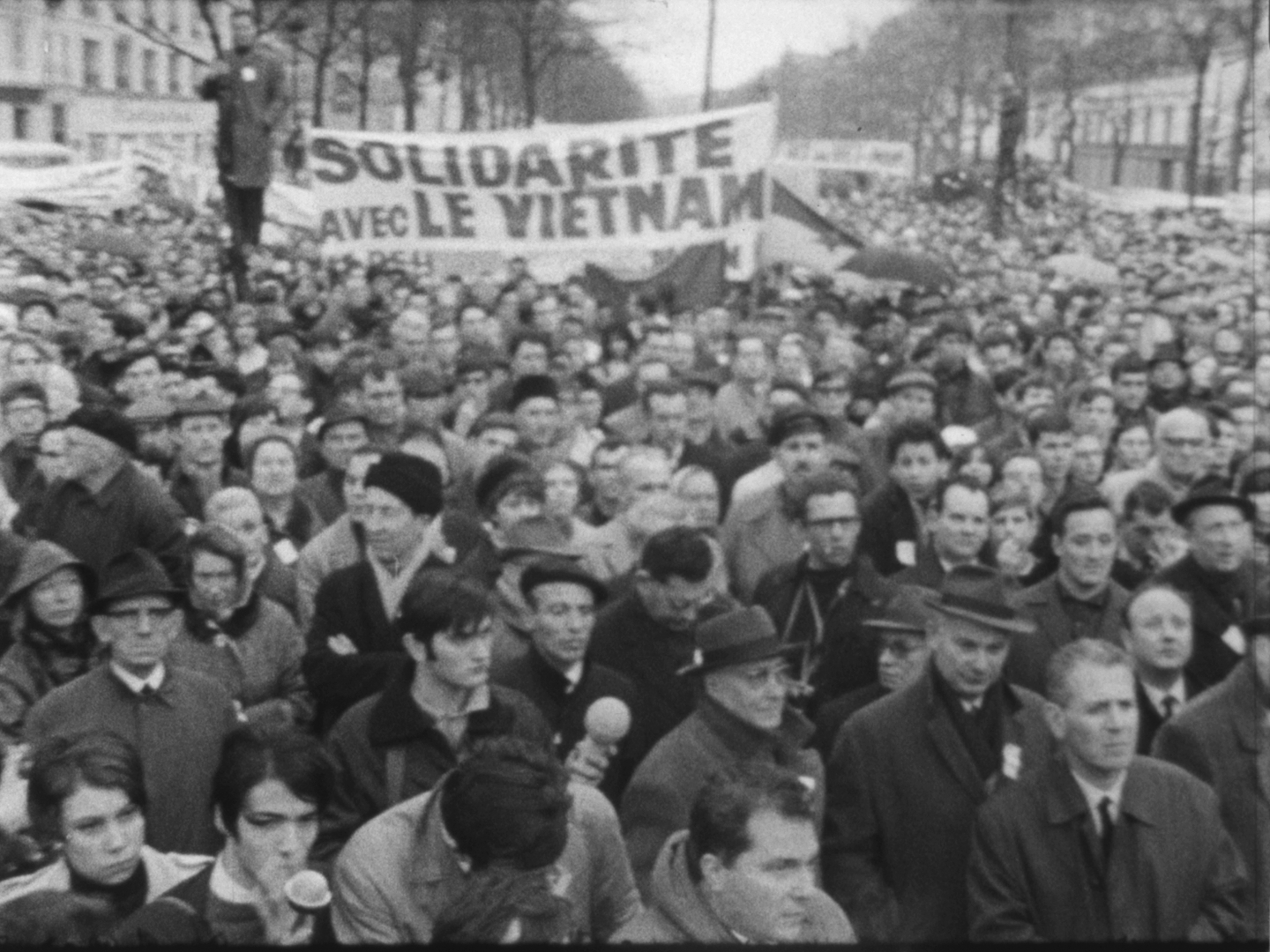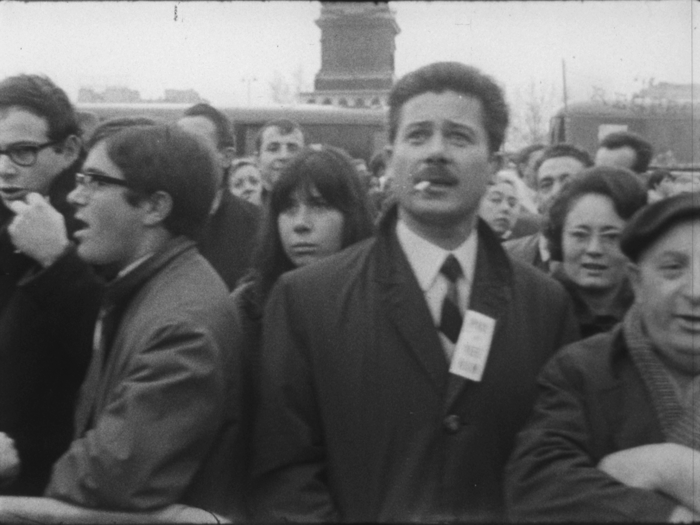 A l'issue des discours, la foule se dirige vers le Faubourg-Saint-Antoine. On aperçoit de nombreux jeunes gens défilant sous des banderoles, dont Alain Krivine, exclu de l'UEC quelques temps auparavant et confondateur de la JCR (Jeunesse Communiste Révolutionnaire)