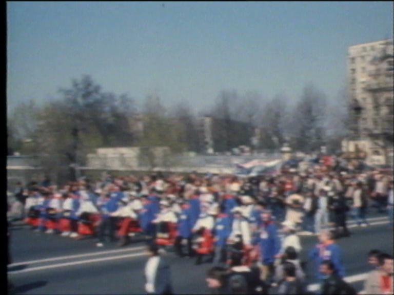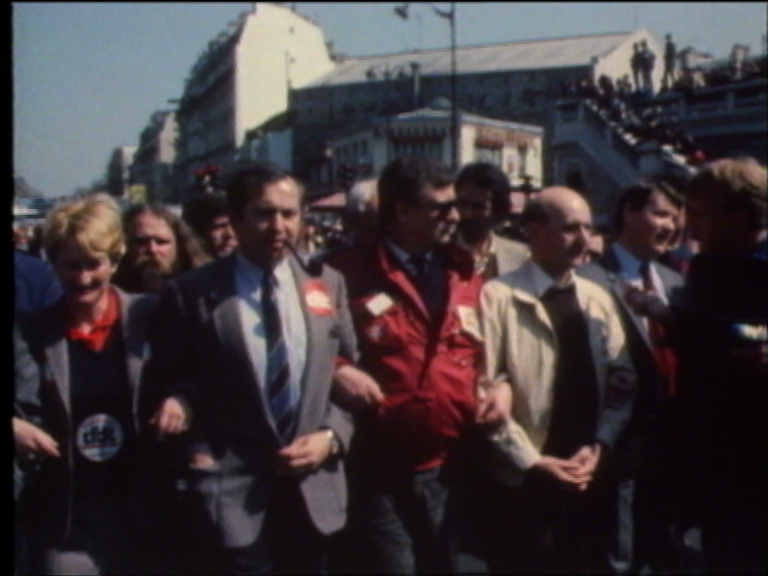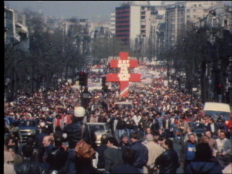 Henri Krasucki dans la foule est interviewé. Il défile aux côtés de Nicole Notat de la CFDT. Une grande croix de Lorraine est portée dans le cortège.