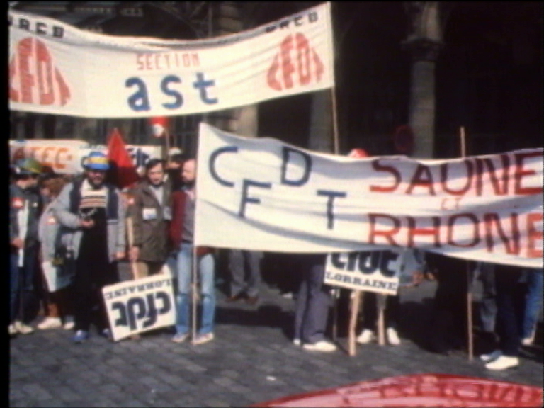 Arrivée de manifestants descendant des trains, casqués, « Non à la liquidation du bassin ferrifère Lorrain» « Sacilor Vivra ».Au son des sirènes. Des drapeaux rouges et une croix de Lorraine. Mot d'ordre : François, tu nous déçois ». Panneau unitaire CFDT FO FEN CFTC CGT. Banderole « Les mines de fer de Lorraine ».
