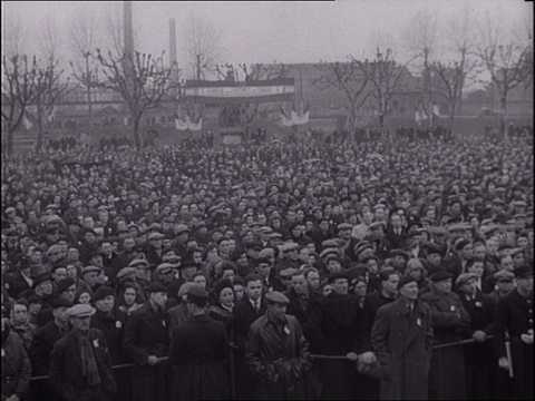 Discours de Maurice Thorez devant les mineurs (probablement à Montceau-les-Mines en février 1946). La foule est dense. Plan sur les porte-drapeaux des mineurs (syndicat CGT des mineurs et similaires) au pied de la tribune sur laquelle est juché le dirigeant communiste. Une délégation de femmes et de mineurs vient lui porter des fleurs et l'embrasser.