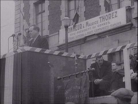 La caméra le suit en déplacement (il pourrait s'agir de son discours "Courage et confiance pour gagner de nouvelles batailles !" prononcé à Montceau-les-Mines le 17 février 1946). Il s'adresse à une foule de mineurs sur le parvis de la mairie. Un calicot accroché au bâtiment indique "Honneur à Maurice Thorez, vice-président du Conseil, secrétaire général du Parti Communiste Français".